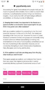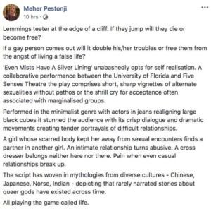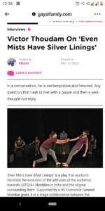 Media Coverage 89761 80425 Our Media Coverage Gallery All Watch A Play Even Mists Have Silver Linings Mumbai Mirror 1st December World Aids Day रुस्तम, हमराही और सोहराब के बीच चला संवादों का सिलसिला - Media News इंसान और बिजूका के बीच खत्म होते अंतर को दर्शाता 'सलीब - #1 Media News इंसान और बिजूका के बीच खत्म होते अंतर को दर्शाता 'सलीब - #2Media News 'सलीब' ने सिखाया सलीका Five Senses Theatre Group - News Gaysifamily.com - #01 News HindustanTimes - Chronicles Of Love, Hope And Acceptance Gaysifamily.com - #02 News Meher Pestonji - Social Media Post Theatre Review - TimesGroup Gaysifamily.com - 03# News MumbaiMirror - The Bright Side Of The Rainbow Gaysifamily.com - 04# News Gaysifamily.com - #05 New Victor Thoudam On 'Even Mists Have Silver Linings' Mid-day News - Queer expressions Mid-day News - A play on emotions The Hindu News - From the fringes THE ALCHEMY OF Astonishment Engaging the Power of Theatre By WILL WEIGLER Kiss Of The Spider Woman News #01 Five Senses Theatre Group - News Hardik Shah - Tweet THE ALCHEMY OF Astonishment Engaging the Power of Theatre By WILL WEIGLER Five Senses Theatre ''Kiss of the Spider Woman'' Five Senses Theatre Group Present "THE JOB" - News #01 Five Senses Theatre Group Present "THE JOB" - News #02 Five Senses Theatre Group Present "THE JOB" - News #03 Five Senses Theatre Group Present "THE JOB" - News #04 Five Senses Theatre Group Present "THE JOB" - News #05 Five Senses Theatre Group Present "THE JOB" - News #06 Mid-day - Theatre For And Of Change Kiss Of The Spider Woman News #02 Five Senses Theatre Group Theatre "PHOOL & FOOLS" - News #01 Five Senses Theatre Group Theatre "PHOOL & FOOLS" - News #02 Five Senses Theatre Group Theatre "PHOOL & FOOLS" - News #03 Five Senses Theatre Group Theatre "PHOOL & FOOLS" - News #04 Five Senses Theatre Group Theatre "RUSTOM O SHORAB" - News #01 Five Senses Theatre Group Theatre "RUSTOM O SHORAB" - News #02 Five Senses Theatre Group Present "THE JOB" - News #07 Five Senses Theatre Group Present "THE JOB" - News #08